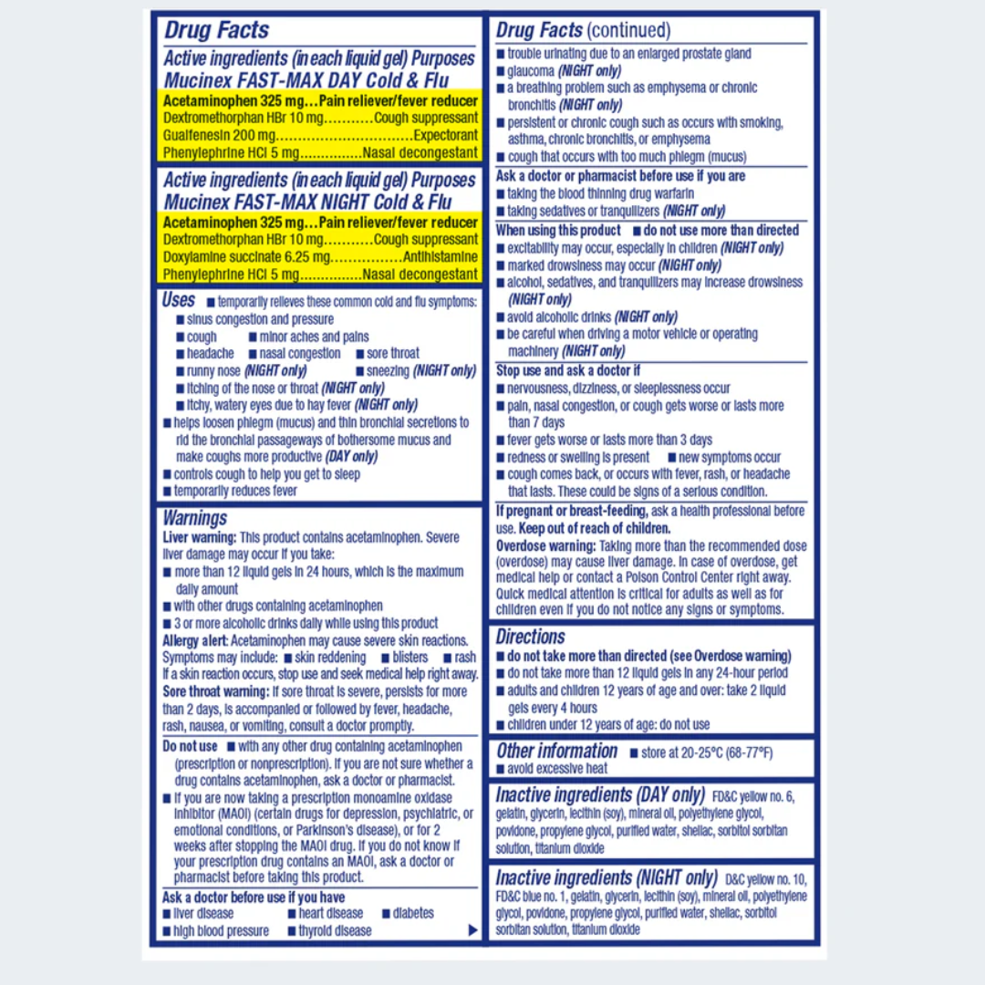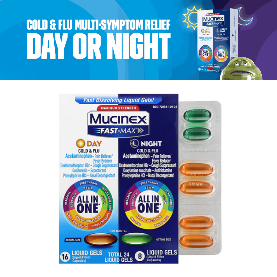 Mucinex, Fast-Max สูตรกลางวันและกลางคืนสำหรับลดอาการไม่สบายต่างๆได้ถึง 9 อาการ สูตรเข้มข้นสูงสุด สำหรับเด็กอายุ 12 ปีขึ้นไป 24 แคปซูล