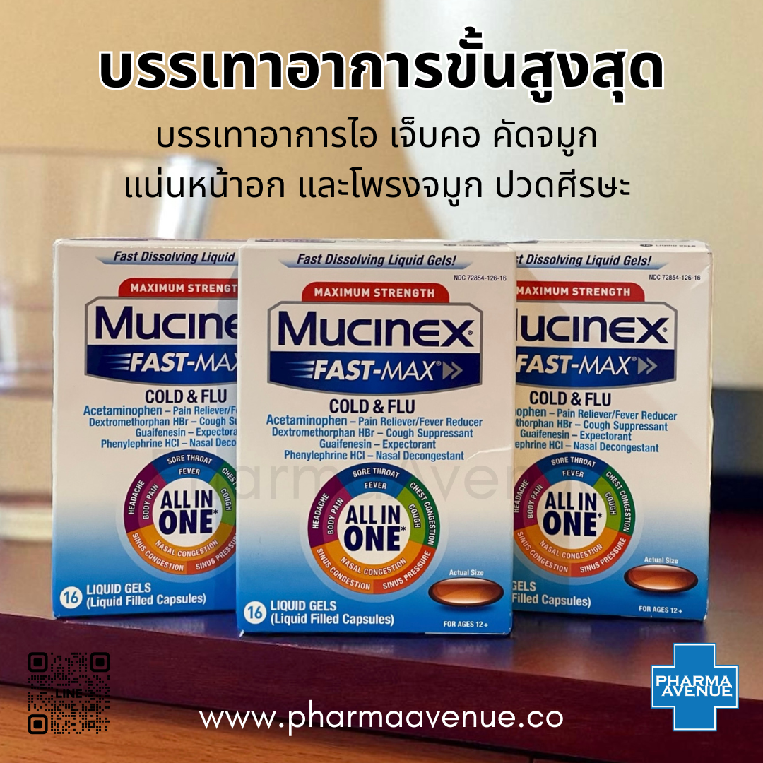 Mucinex Fast-Max Cold & Flu All In One สูตร Maximum Strength ช่วยลดไข้ บรรเทาอาการไอ เจ็บคอ คัดจมูก แน่นหน้าอก และโพรงจมูก ปวดศีรษะ รวมถึงอาการปวดเมื่อยเล็กน้อย